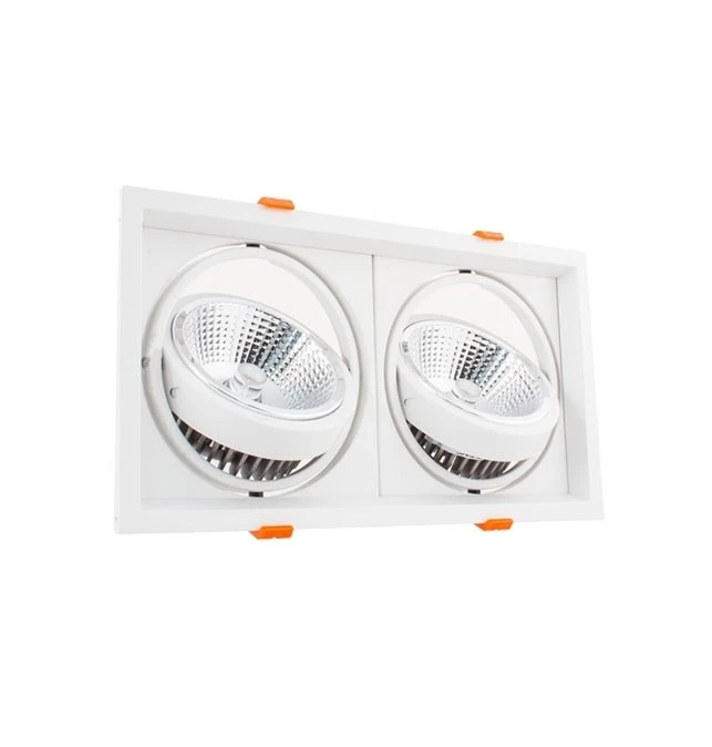 Aplique para AR111 cuadrado doble blanco basculante para empotrar en techo de último diseño fabricado en ABS plástico térmico.