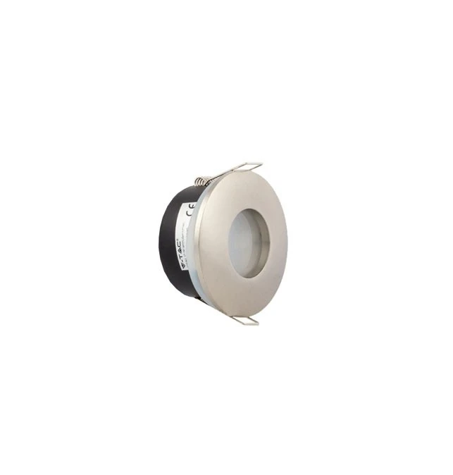 Aplique redondo acero pulido para empotrar en techo IP54 para utilizar con bombillas de led de casquillo GU-10 ó MR-16. Especialmente indicado para uso en cuartos de baño.
