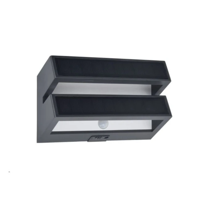 El aplique BARLO es un aplique solar de pared que destaca por su diseño contemporáneo en color gris oscuro y su función inteligente de iluminación. Este aplique no es solo decorativo: difunde la luz desde su panel frontal e incorpora un sensor PIR de movimiento, activándose automáticamente cuando detecta presencia.