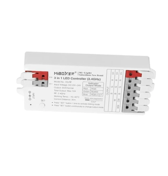 El Controlador LED 3 en 1 es una solución avanzada y eficiente para gestionar tiras de LED de 12V y 24V en sistemas RGB, RGBW y RGB+CCT. Diseñado para ofrecer una instalación sencilla sin necesidad de herramientas adicionales, este controlador destaca por su compatibilidad con mandos a distancia Mi-Light y MiBoxer, proporcionando un control completo sobre la iluminación de tu hogar o espacio comercial. Con un botón, puedes alternar entre modos RGB, RGBW y RGB+CCT, proporcionando una iluminación flexible y personalizada.
