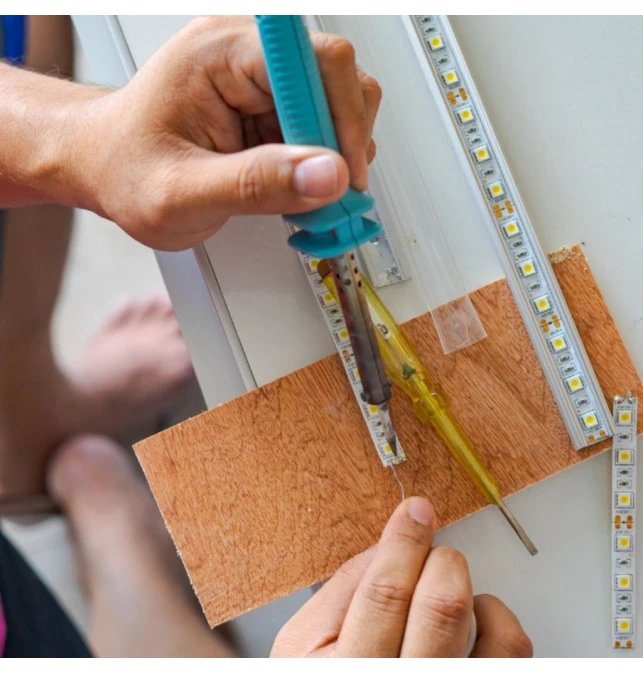 Soldadura de tiras leds a 220V. Se le suelda el cable inicial y el tapón final para poder conectarla directamente a la corriente a 220V.