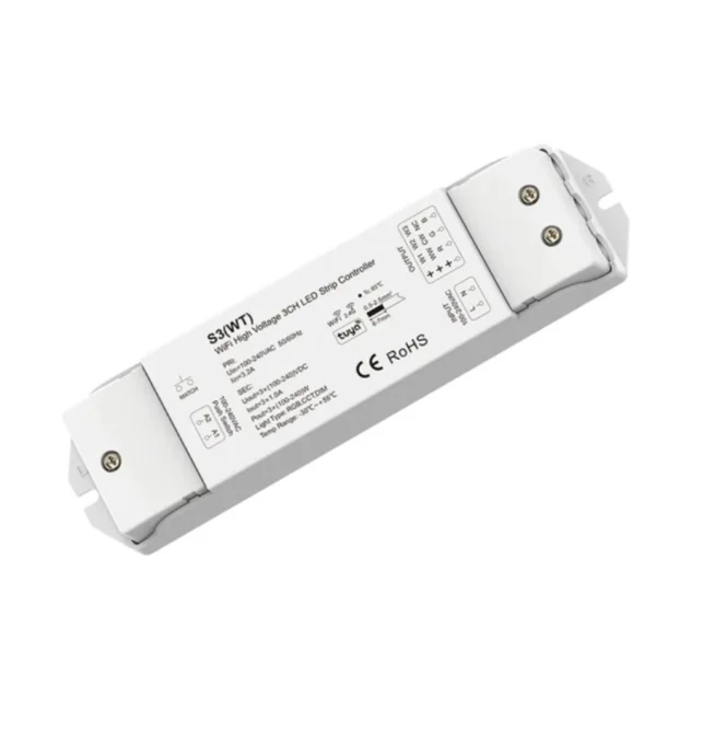 Este controlador de 3 canales es una solución versátil que te permite controlar tu iluminación LED desde app móvil, interruptor físico o mando inalámbrico, ajustando color, temperatura y brillo sin complicaciones, ya sea en tu casa o en un proyecto profesional.