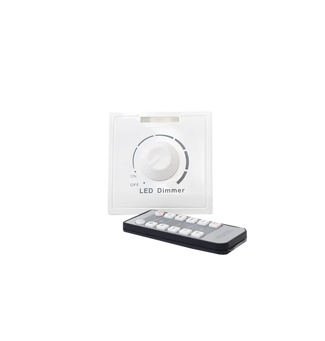 Dimmer o regulador de intensidad para productos led como bombillas o downlight. Tiene un mando central con rueda giratoria para empotrar en pared o instalar en superficie, también dispone de un mando para control remoto que funciona por infrarrojos y tiene un alcance máximo de 10m.