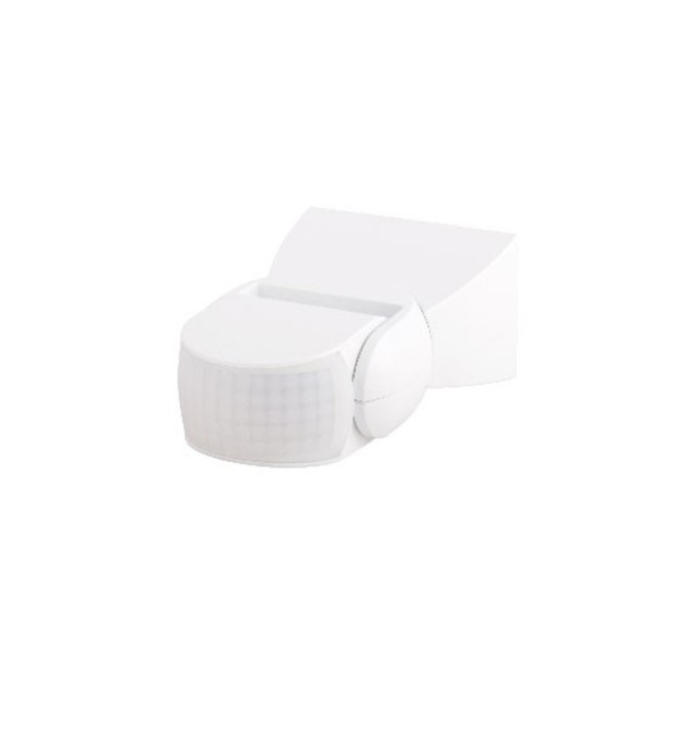 Detector de movimiento por infrarrojos acabado en blanco y grado de protección IP65 , para instalar en superficie en pared, que permite el encendido y apagado automático de iluminación incandescente, halógena de bajo consumo y led.