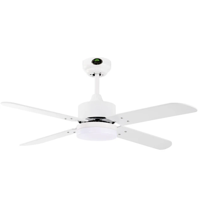 Su estructura está fabricada en metal con acabado en color blanco. Su difusor está fabricado en acrílico y sus palas reversibles son con acabado blanco y madera