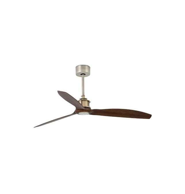 Ventilador de techo JUST FAN acabado dorado y madera marca Faro. Motor DC de bajo consumo. Este ventilador estilo industrial tiene un esqueleto de metal con un diseño estilizado y rompedor. Accionado por mando a distancia, incluido. Es ideal para la ventilación de habitaciones desde 13m2 hasta 17m2. Dispone de 6 velocidades regulables con un consumo de 4-6-9-13-22-32W y 51-77-103-129-155-185 revoluciones por minuto según velocidad.